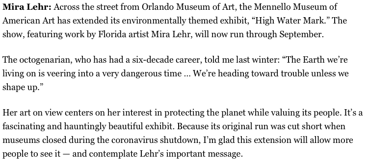 Jeffers, Lehr, Butler, Meyer, JEFRË and more: Latest Orlando art news - Orlando Sentinel /October 9, 2020 by Mira Lehr Click here to view the entire article.
